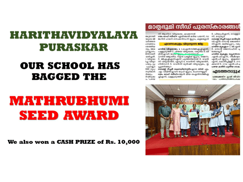 School bagged the Haritha Vidyalaya Puraskar (second place) by Mathrubhumi as a part of Mathrubhumi SEED Award (Ernakulam Education District). We also received cash prize of Rs. 10,000/-.